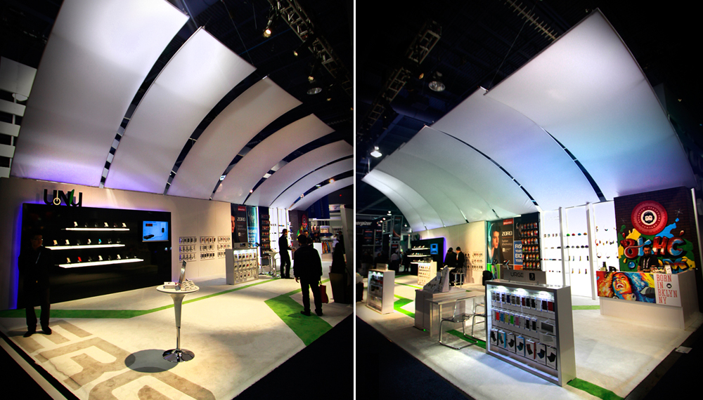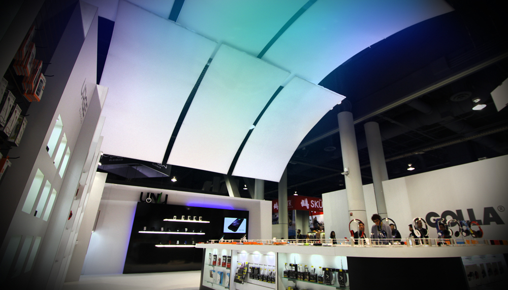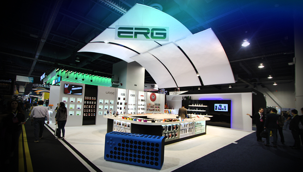 Having an odd 20' x 80' peninsula space in 2014, we designed ERG's CES booth with utmost reconfigurability in mind. Almost every single piece of material from fabric ceiling canopies down to every wall panel were reconfigured and reused in 2015.